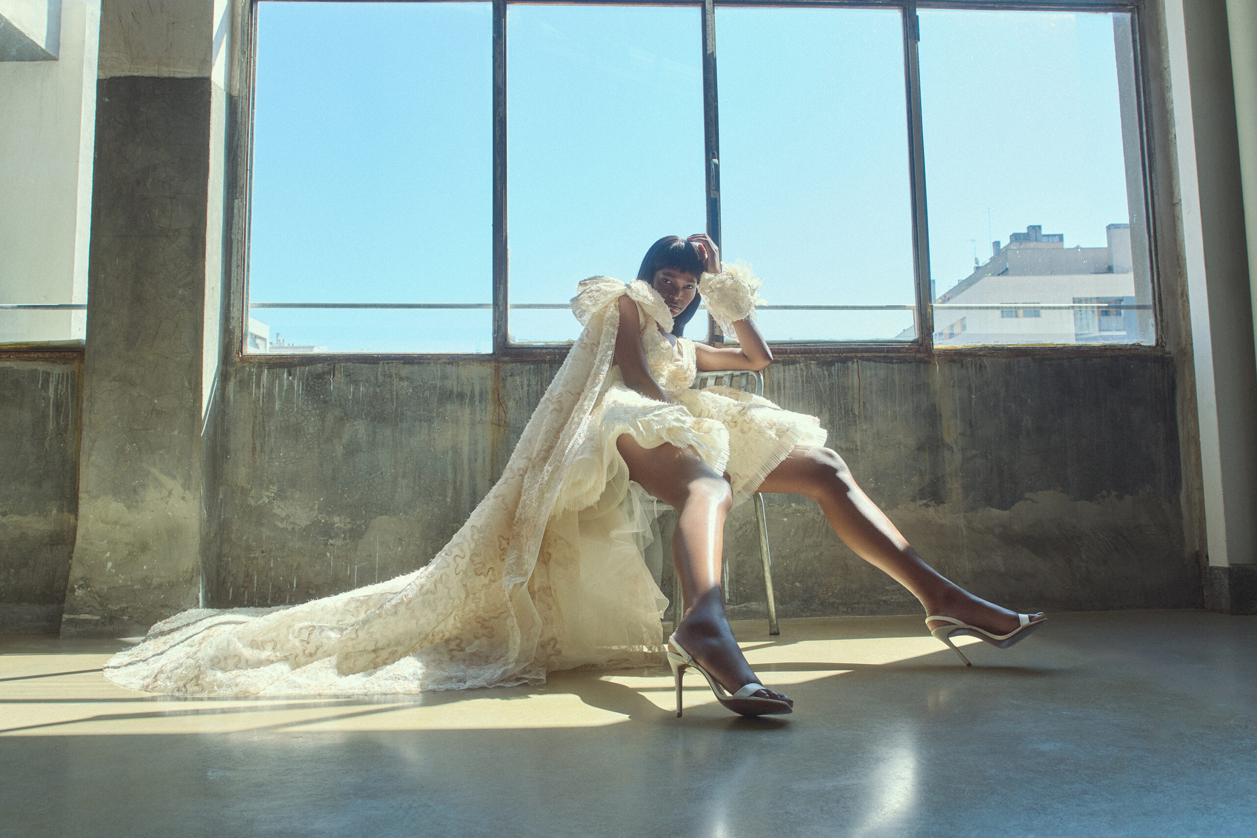 La robe de mariée Agapanthe, collection Studio 2026, Hautre Couture. Une robe de mariée originale courte devant et longue à l’arrière en dentelle de Calais-Caudry. Une allure sensationnelle avec cette création unique en dentelle de Calais-Caudry, aux motifs graphiques ivoire et vieux rose. Un profond décolleté en V effet illusion et jeux de transparence, dévoile le style moderne de cette robe de mariée avant-gardiste. Un grand nœud structuré se pose sur l’une des bretelles, créant l’illusion d’une asymétrie sophistiqué. Ce détail luxueux assure prestance et raffinement, en retombant comme un voile en tulle en mouvement aérien. La taille est soulignée par une large bande, telle une ceinture affinant la silhouette. Le corsage est magnifié par ses découpes en tulle effet illusion sur les côtés, offrant un style contemporain à la pointe de la tendance. Un décolleté plongeant dans le dos en V arrondi, est fermé par d’élégants boutons recouverts. Sa jupe ample à godets dévoile une coupe spectaculaire très couture. Une jupe courte devant et longue à l’arrière en traîne, laissant entrevoir un mélange d’organza et de tulle plissé. À la fois glamour, romantique et dans l’air du temps, cette robe de mariée au caractère affirmé sera séduire les mariées audacieuses, qui dévoileront leur personnalité avec assurance.